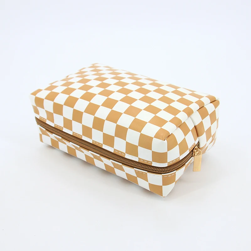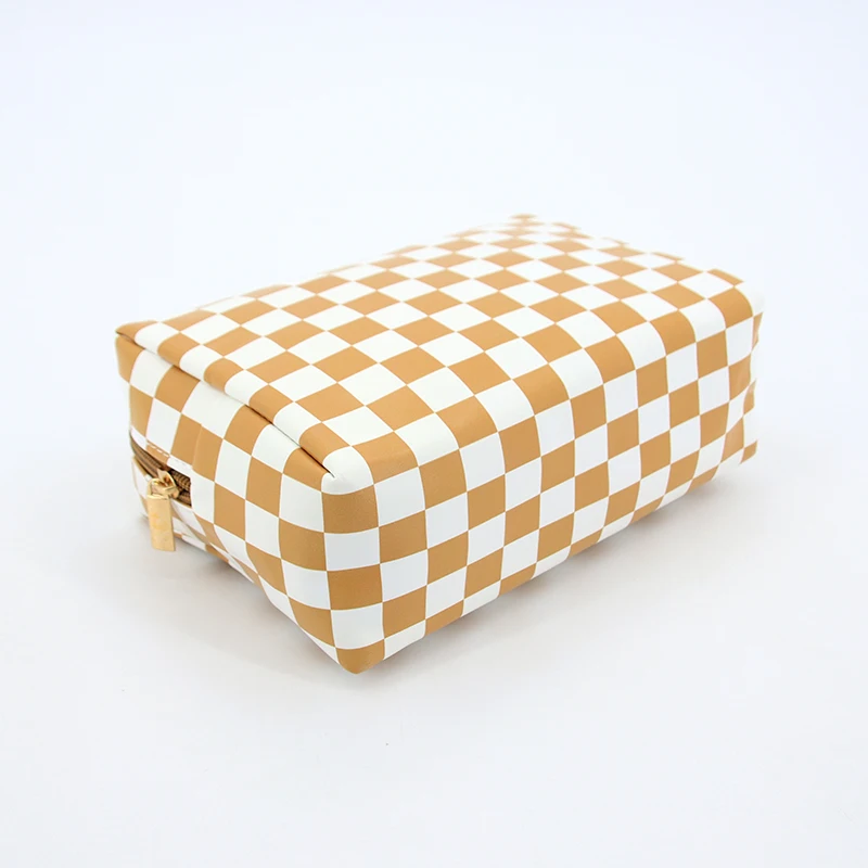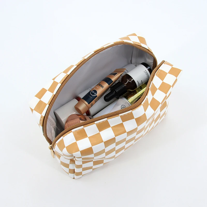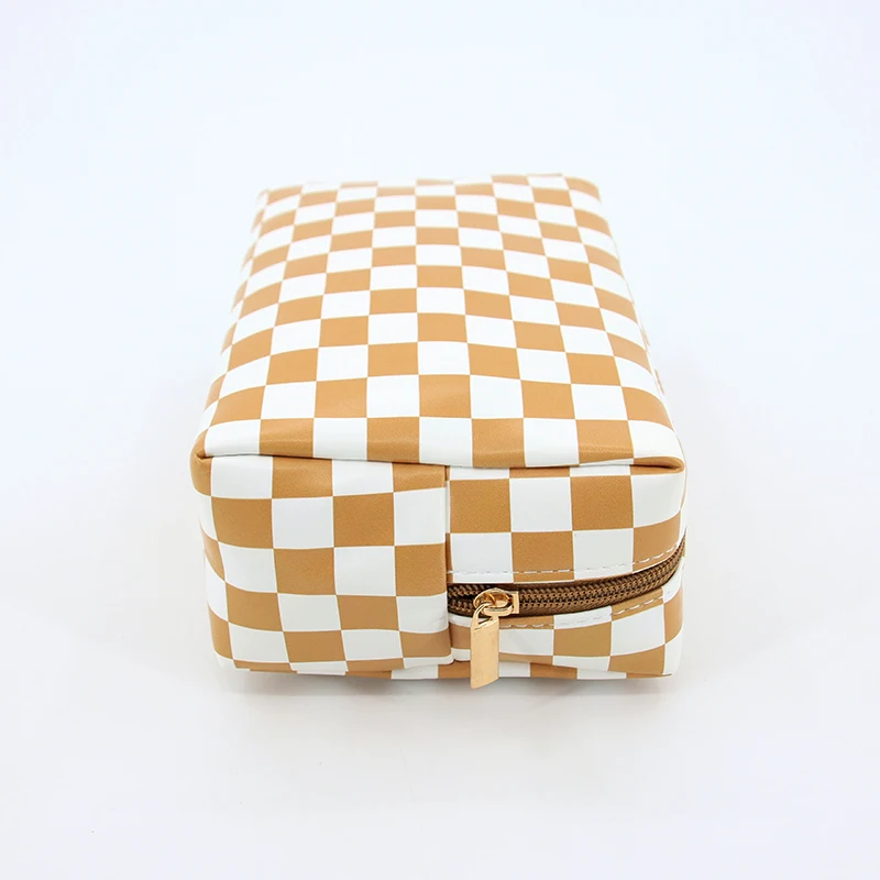 Laget av høykvalitets PU-materiale er denne makeupposen slitesterk og holdbar. Det elegante sjakkmønsteret gir et elegant preg til din skjønnhetsrutine og gjør den til en stilfull tilleggsdel i samlingen din. Den tilpassede størrelsen på posen sikrer at du kan få plass til alle essensielle produkter inni uten å ta opp for mye plass i bagasjen.