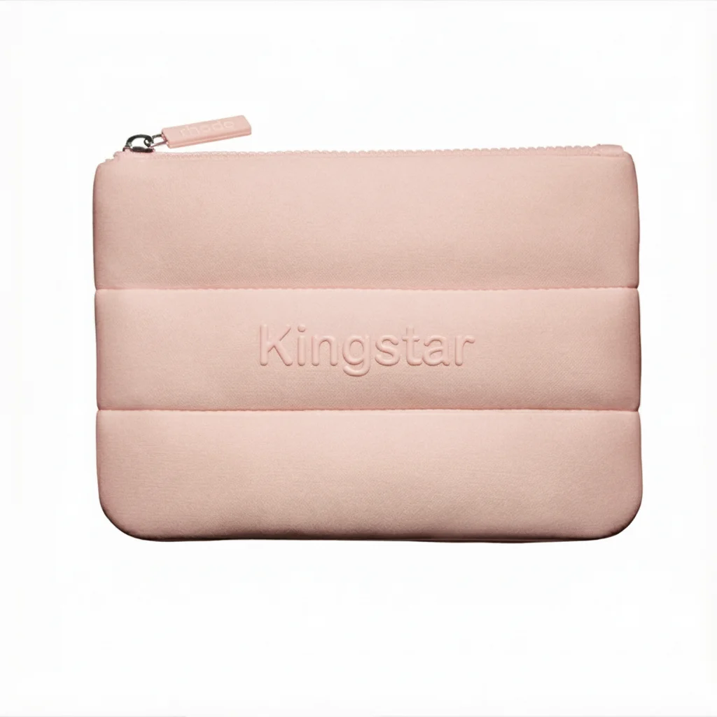 Meet the KINGSTAR Customized Large Neoprene Portable Pouch — a simple, smart bag made for everyday life. This roomy cosmetic and makeup bag mixes soft, bubbly style with useful design. The outside has a raised, embossed logo and a puffy bubble look that feels light and modern. The soft neoprene body gives a little stretch and cushion, so bottles and brushes sit comfortably without banging together